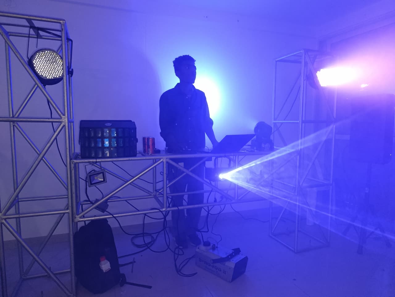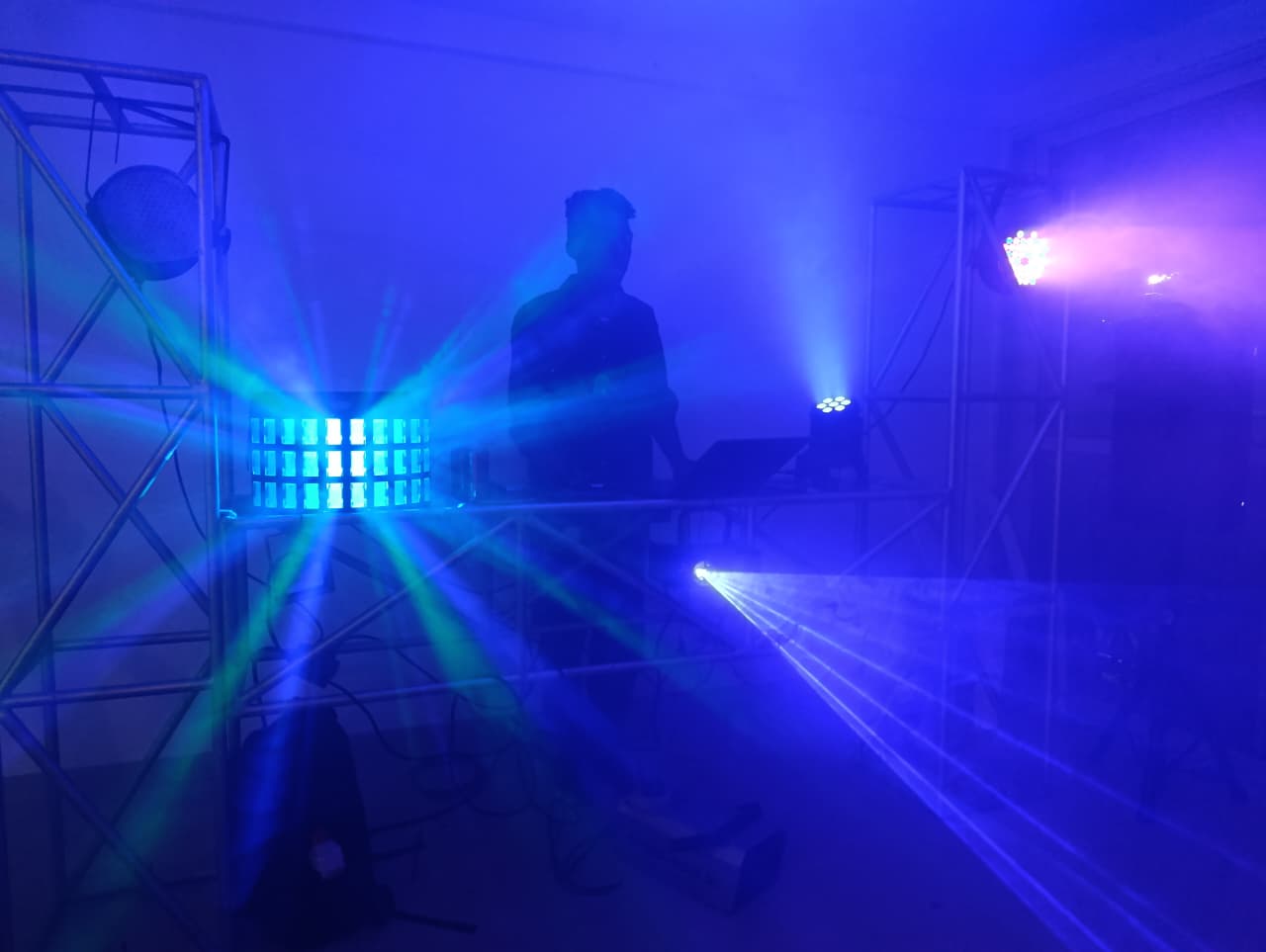 La miniteca saimiri incluye como montaje principal una estructura tipo H en Truss donde van los juegos de 3 luces; audio rítmica, laser y robótica, el mixer, la laptop para reproducir y mezclar tu música preferida online desde Spotify premium (opción de organizar la playlist antes del evento, para descargar las infaltables por si no tiene buena señal el lugar del evento), ambientación además con la máquina de humo al iniciar, dar la bienvenida y durante el evento. Al lado lo acompañan 2 cabinas de sonido activas de 300W ecualizables sobre trípode.